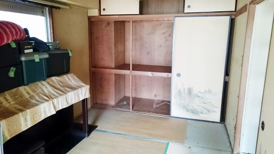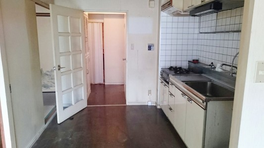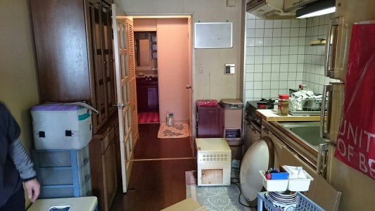 マンション2階の階段、間取り3DK。タンスの中の衣類や引き出しの中はご自分たちでお片付けしてあり、ほぼ空の状態でした。